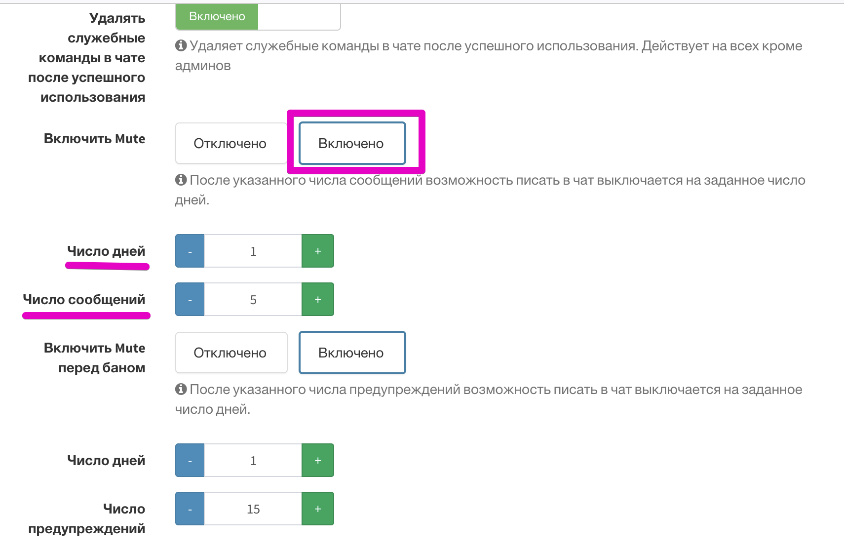 После указанного числа сообщений возможность писать в чат выключается на заданное число дней.