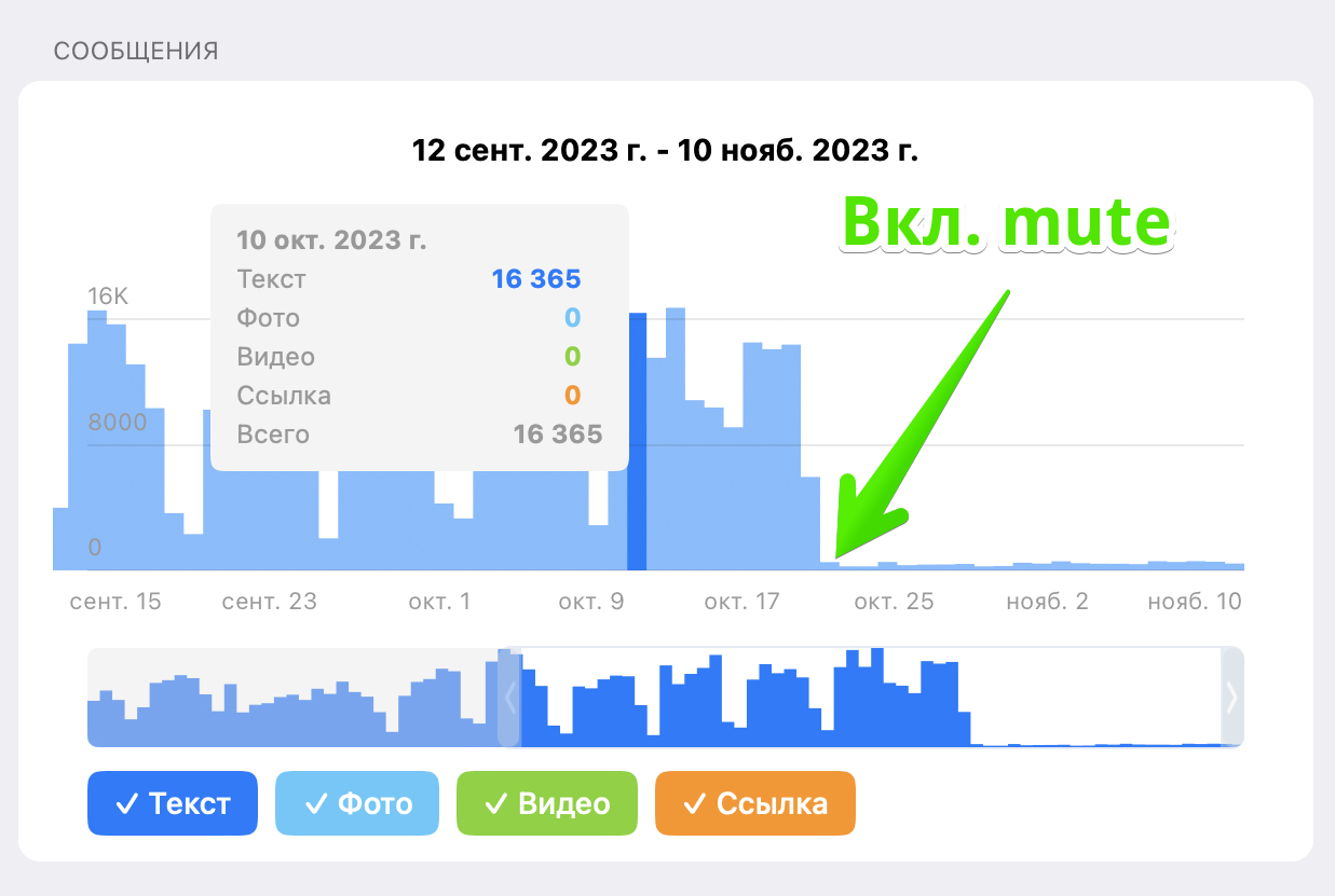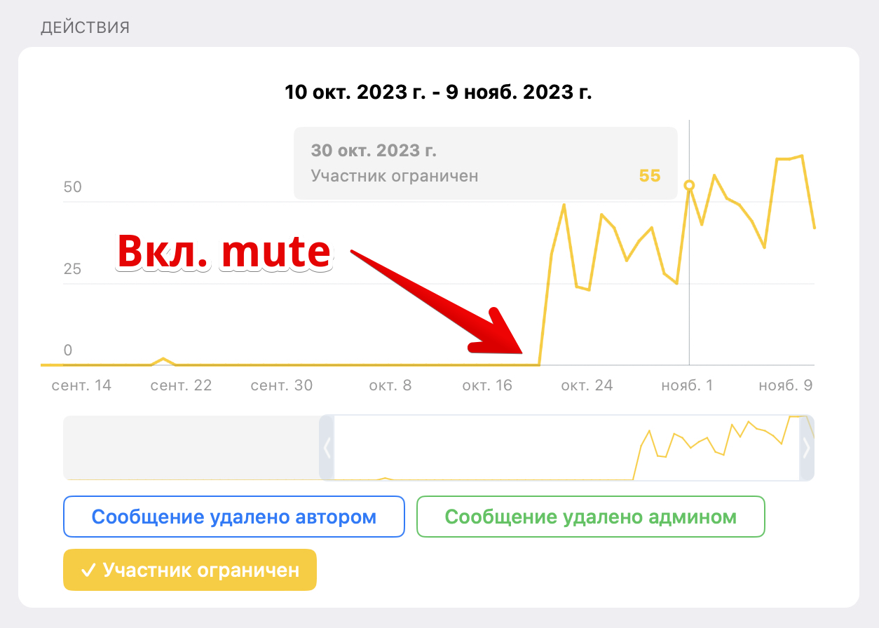 <figure><img src="https://521514978-files.gitbook.io/~/files/v0/b/gitbook-x-prod.appspot.com/o/spaces%2F-MamFn1S2GjEkZdASD7O%2Fuploads%2FDknHbLB6GhYCmGhFgBKk%2F%D0%B8%D0%B7%D0%BE%D0%B1%D1%80%D0%B0%D0%B6%D0%B5%D0%BD%D0%B8%D0%B5.png?alt=media&#x26;token=ecb5ca7a-09b0-436e-969c-1b789454a31b" alt=""><figcaption><p>Сколько пользователей получили mute на сутки</p></figcaption></figure>