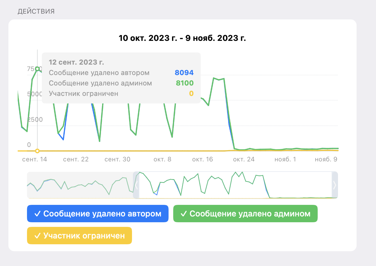 <figure><img src="https://521514978-files.gitbook.io/~/files/v0/b/gitbook-x-prod.appspot.com/o/spaces%2F-MamFn1S2GjEkZdASD7O%2Fuploads%2Fb3lvkw5eYzkKxiQAQ4Ub%2F%D0%B8%D0%B7%D0%BE%D0%B1%D1%80%D0%B0%D0%B6%D0%B5%D0%BD%D0%B8%D0%B5.png?alt=media&#x26;token=5c56213b-91f6-4f6b-9a48-59d6cba4882f" alt=""><figcaption><p>Сколько удалено ботом со ссылками</p></figcaption></figure>